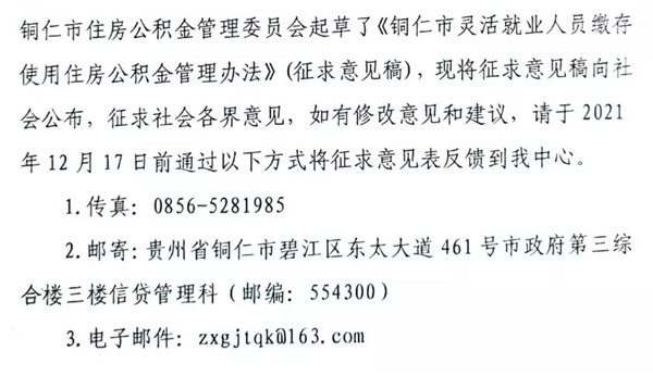 為進一步擴大住房公積金制度覆蓋面,加大對新市民等靈活就業人員解決自住住房需求的支持力度,銅仁市住房公積金管理中心起草并發布《銅仁市靈活就業人員繳存使用住房公積金管理辦法》(征求意見稿)意見的公告。廣大市民可于2021年12月17日前通過以下方式反饋意見。