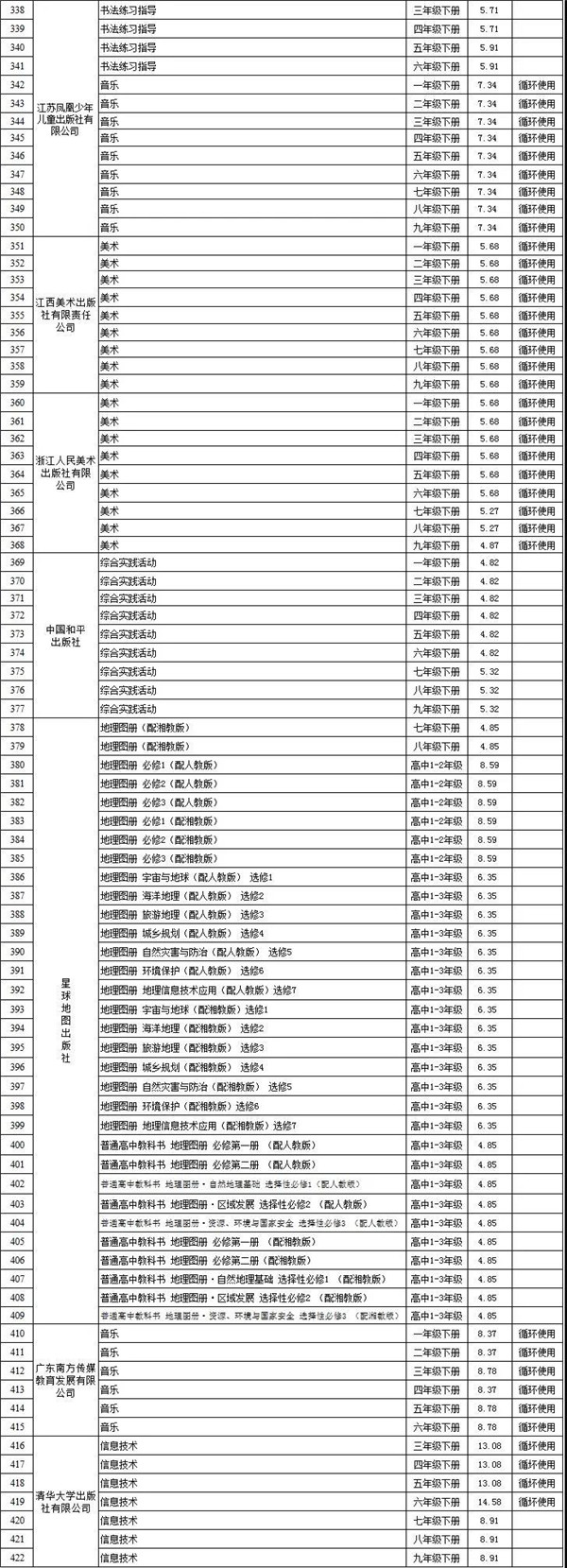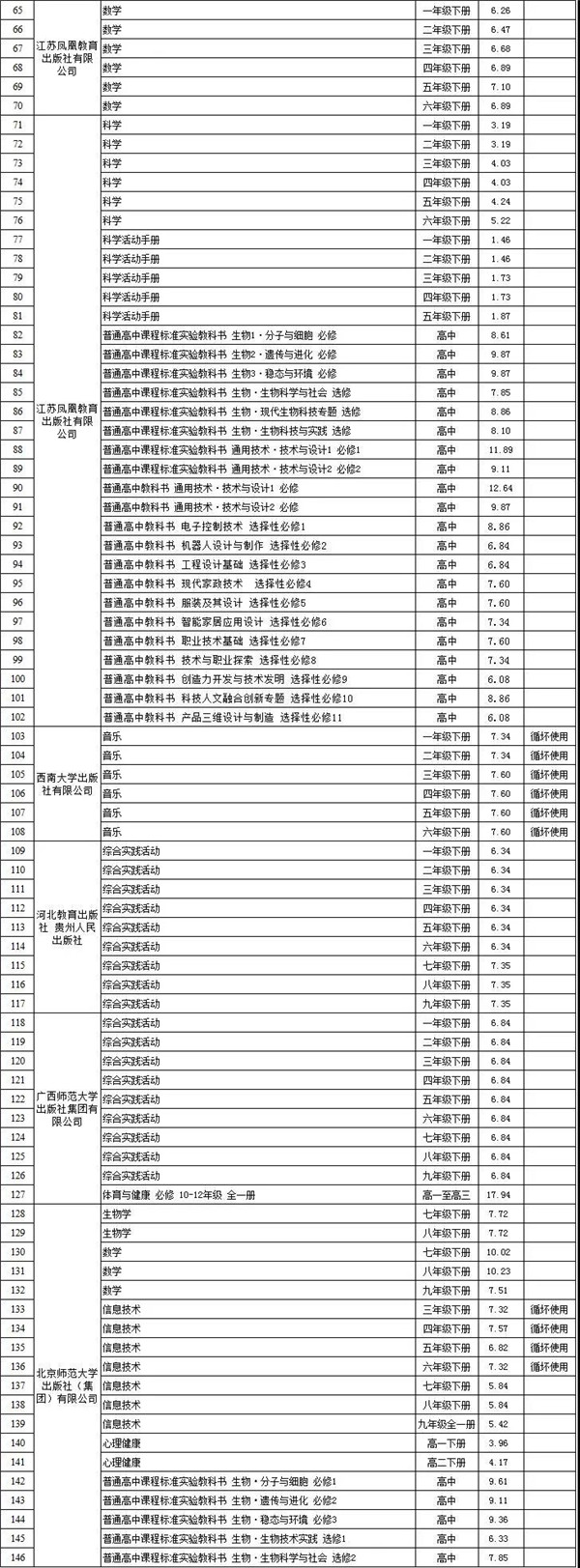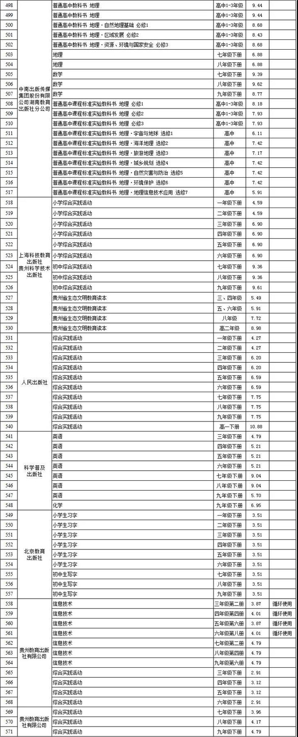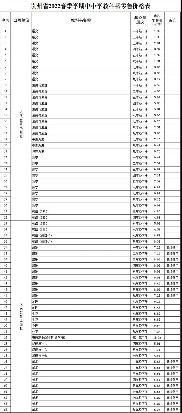 貴州省2022年春季學(xué)期中小學(xué)教科書(shū)零售價(jià)格具體如下: