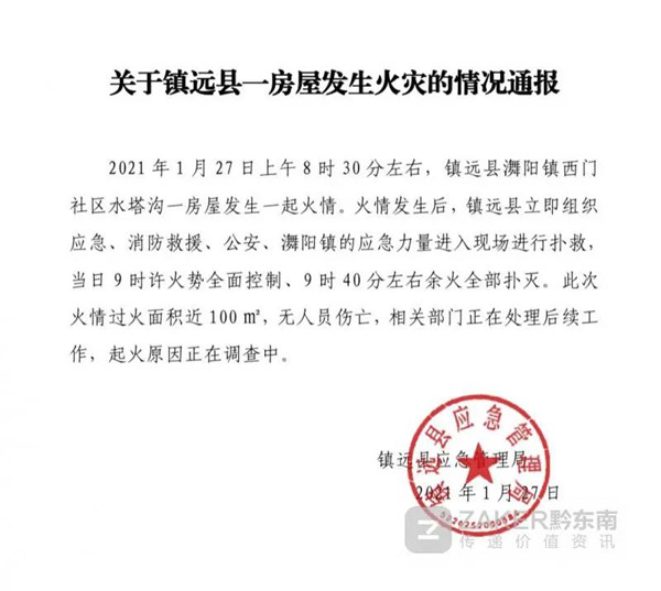 2021年1月27日上午8時30分左右,鎮遠縣舞陽鎮西門社區水塔溝一房屋發生一起火情。火情發生后,鎮遠縣立即組織應急、消防救援、公安、舞陽鎮的應急力量進入現場進行撲救, 當日9時許火勢全面控制、9時40分左右余火全部撲滅。此次火情過火面積近100m²,無人員傷亡,相關部門正在處理后續工作,起火原因正在調查中。