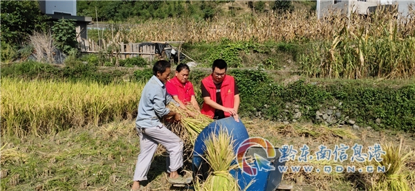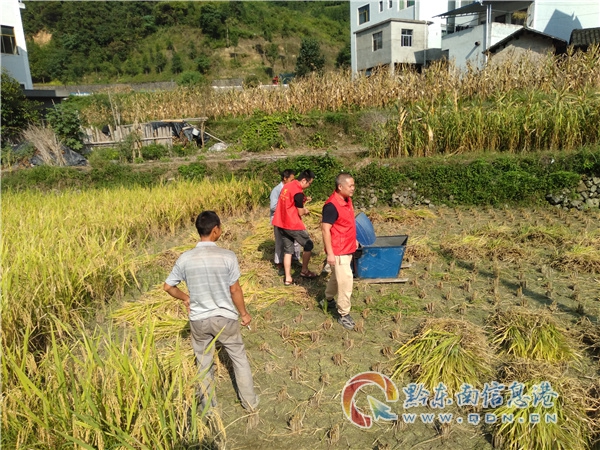 9月9日,趁著天氣晴朗,適合收割曬糧,駐村工作隊主動了解情況,得知建檔立卡戶楊政隆家稻谷還沒有收完,且家里主要勞動力都在外出打工,工作隊便來到楊政隆家幫助搶收糧食。