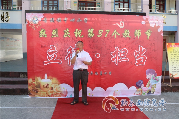 本網(wǎng)訊 晨曦細(xì)雨育桃李,金秋碩果慰園丁。在這秋風(fēng)送爽、碩果飄香的美好時(shí)節(jié),第37個(gè)教師節(jié)悄然而至。為營(yíng)造尊師重教的濃厚氛圍,弘揚(yáng)尊師重教的良好風(fēng)尚, 2021年9月9日,鎮(zhèn)遠(yuǎn)縣青溪中心小學(xué)全體師生齊聚一堂,慶祝第37個(gè)教師節(jié)。