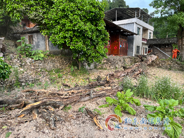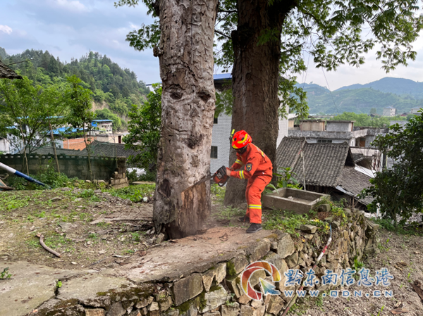 下午17時許,消防救援人員到達現(xiàn)場,經(jīng)現(xiàn)場勘察,發(fā)現(xiàn)老樹直徑約1米,高約20余米,樹干蟲蛀嚴重,根部已經(jīng)腐朽,除左邊有一塊菜地外,周邊都是民房,現(xiàn)場情況,異常復雜。在了解情況后,現(xiàn)場政府工作人員和村干到場協(xié)助周邊村民疏散。一切準備就緒后,消防員將一條牽引繩固定在古樹樹干上,利用機動鏈鋸從根部鋸開了一個缺口,在牽引繩的拖拽下,古樹成功傾倒于房屋左側的菜地里,將損失降到了極小。