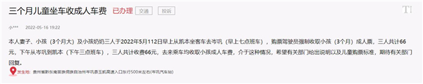 “本人妻子、小孩(3個月大)及孩子奶奶5月12日早上從凱本坐客車去岑鞏,駕駛員強制收取小孩成人票,三人共收費66元。下午從岑鞏到凱本,三人又被收費66元。”該網友表示,往返乘車均收取小孩成人車費,希望有關部門給出說明及兒童購票標準。