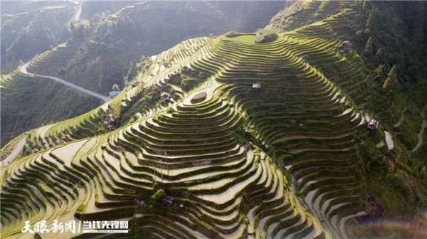 青山環抱,層層疊疊的加榜梯田閃耀著銀白色的光芒,儼然一幅徐徐展開的畫卷。