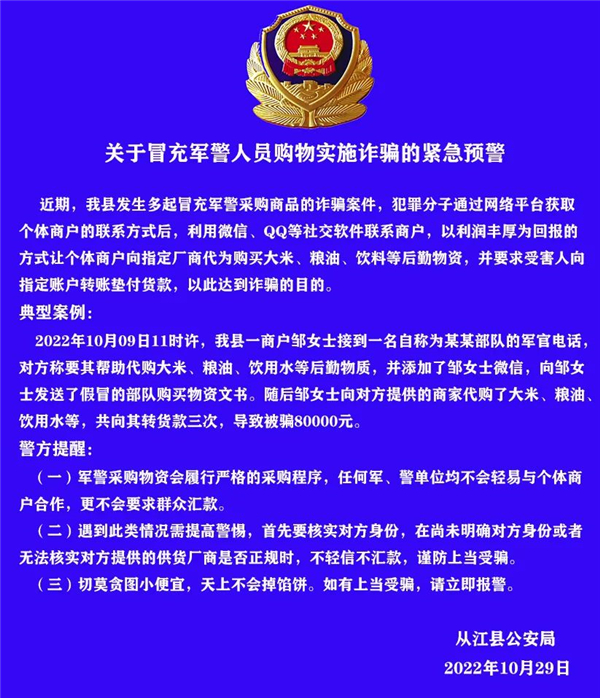 從江:關于冒充軍警人員購物實施詐騙的緊急預警