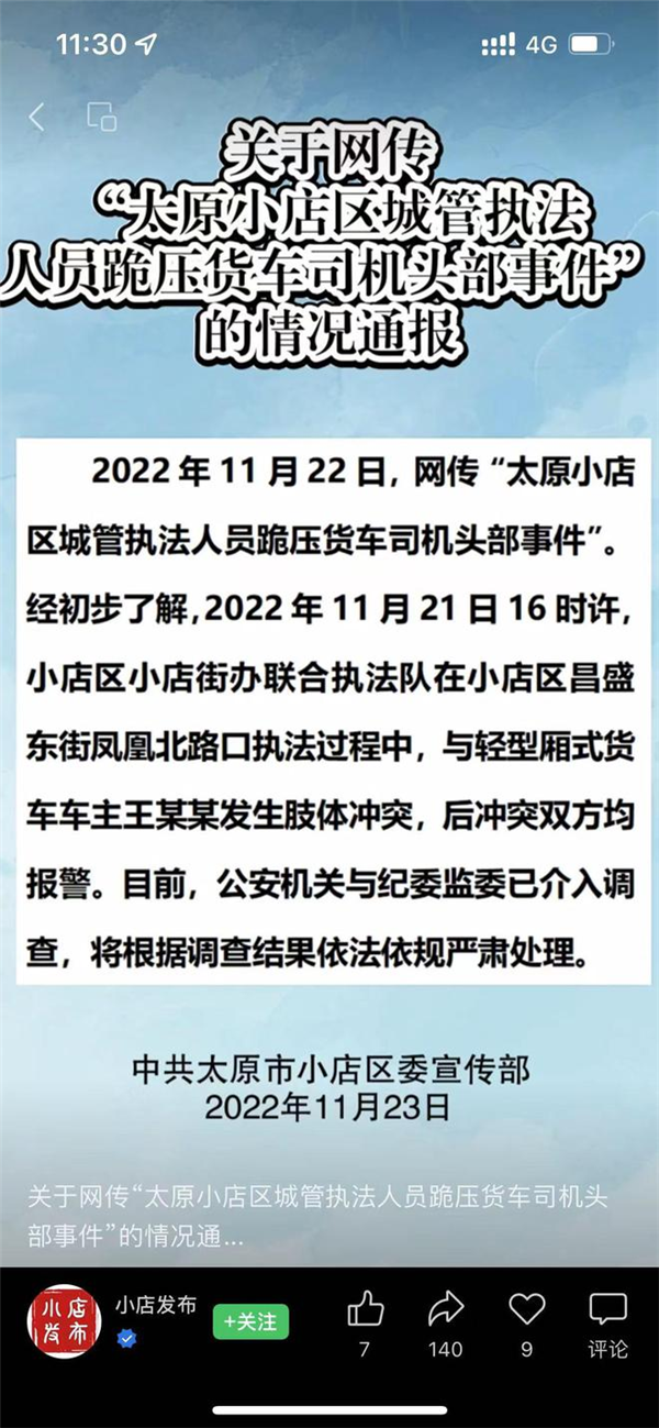2022年11月22日,網傳“太原小店區(qū)城管執(zhí)法人員跪壓貨車司機頭部事件”。經初步了解,2022年11月21日16時許,小店區(qū)小店街辦聯合執(zhí)法隊在小店區(qū)昌盛東街鳳凰北路口執(zhí)法過程中,與輕型廂式貨車車主王某某發(fā)生肢體沖突,后沖突雙方均報警。目前,公安機關與紀委監(jiān)委已介入調查,將根據調查結果依法依規(guī)嚴肅處理。