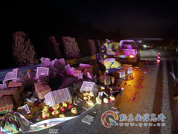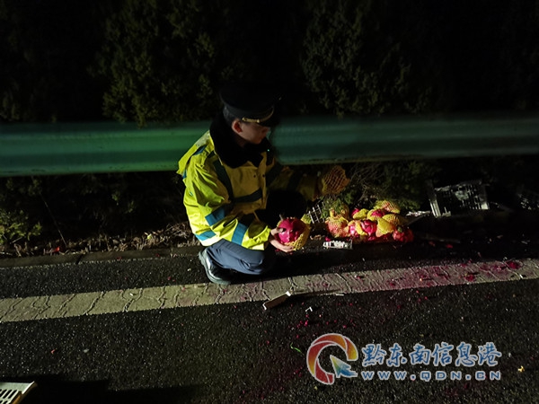 接警后,交通執法人員快速出警05時10分抵達現場。到達現場后,只見有大量的水果(火龍果及青棗約1噸)占據路面超車道,由于春運,路面車流量較大,高速公路“一路多方”及時對現場進行警示渠化。經詢問得知,該車貨物是駕駛人從廣西運往凱里市準備出售的水果,由于長時間開車加上路面濕滑,操作不當導致車輛側翻使水果傾倒,車輛側翻后又再次翻滾使車輛“站了起來”,車輛漆面輕微受損,還可以繼續行駛,駕駛人再次把“站起來”的車輛開到應急車道,隨即撥打報警電話請求救援,本次事故中駕駛人因系了安全帶并未受傷。