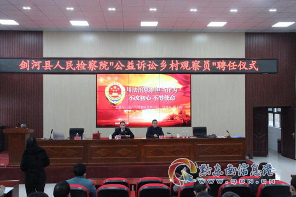 儀式上,檢察長黃卡鐵宣讀了劍河縣人民檢察院《關于聘請劉永發等25人為“公益訴訟鄉村觀察員”的決定》,并為受聘的觀察員頒發聘書。檢察長黃卡鐵表示:希望各位“公益訴訟鄉村觀察員”能夠充分發揮自身立足基層、聯系群眾更為密切的優勢,積極支持和配合檢察機關開展公益訴訟工作,更好的回應人民群眾對美好生活需求的關切。