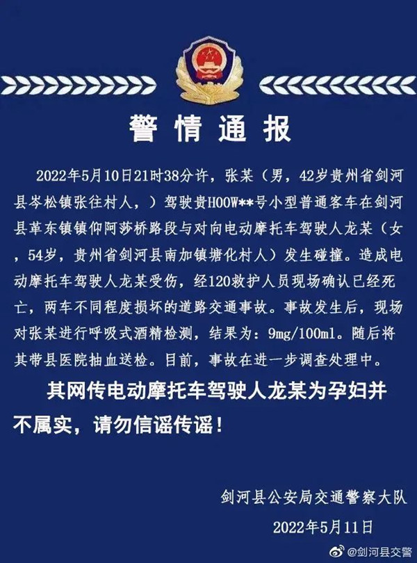 經(jīng)核實,2022年5月10日21時38分,張某駕駛小型普通客車在劍河縣革東鎮(zhèn)鎮(zhèn)仰阿莎橋路段與對向電動摩托車駕駛?cè)她埬嘲l(fā)生碰撞。造成龍某受傷,經(jīng)120救護人員現(xiàn)場確認已經(jīng)死亡,兩車不同程度損壞的道路交通事故。事故發(fā)生后,現(xiàn)場對張某進行呼吸式酒精檢測,結(jié)果為:9mg/100m1。隨后將其帶縣醫(yī)院抽血送檢。目前,事故在進一步調(diào)查處理中。
