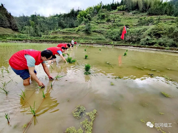 圖為太擁鎮組織黨員干部到寨甩村幫助村民插秧