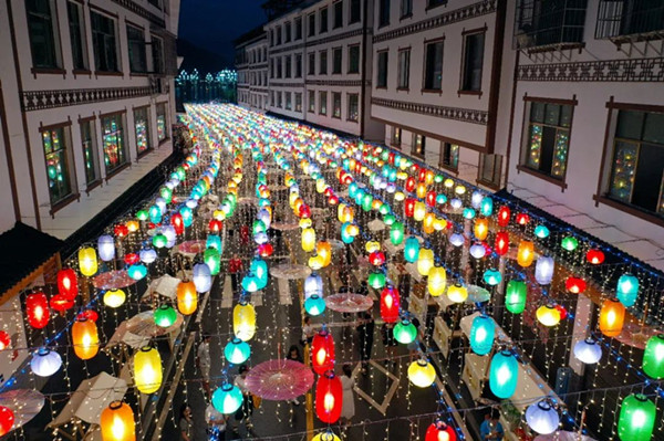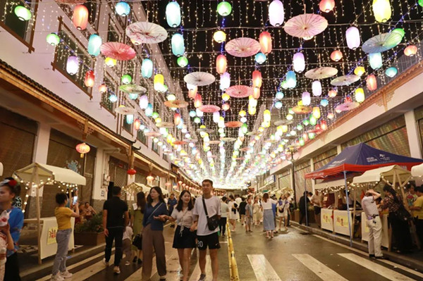 夜集市上最耀眼的景色當(dāng)屬由1000多盞彩色燈籠和油紙傘組成的燈籠長(zhǎng)廊,漫步在商業(yè)街上,抬頭便是璀璨“星空”,氛圍感十足,成為了大家爭(zhēng)相拍照打卡的第一站。