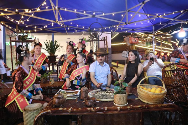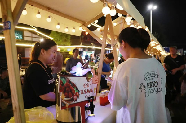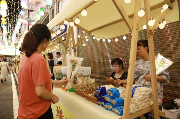 當(dāng)晚“傳統(tǒng)”與“現(xiàn)代”相融,休閑與商機(jī)相接的集市現(xiàn)場(chǎng)流光溢彩,熱鬧非凡。在融合美食、好物、音樂、快閃、非遺技藝展示、民俗展演、農(nóng)副產(chǎn)品宣介等項(xiàng)目元素為一體的夜集市上,近百個(gè)特色攤位林立,讓市民和游客逛足了癮,商家也賺足了人氣。