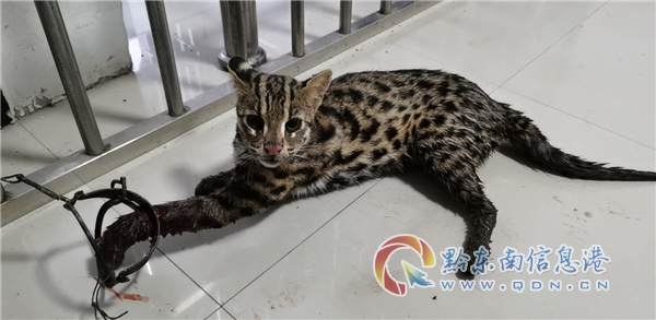 經(jīng)民警查看,該貓科動(dòng)物體長(zhǎng)約30-40厘米,圓頭長(zhǎng)尾,全身從頭至背部布滿不規(guī)則黑色條紋和斑點(diǎn),依據(jù)外形初判,該受傷野貓疑似國(guó)家二級(jí)保護(hù)動(dòng)物——豹貓。派出所民警立即把受傷豹貓安全轉(zhuǎn)移到太擁派出所,但因該豹貓左前肢被捕鼠夾嚴(yán)重夾傷,對(duì)人的靠近極度敏感,在派出所內(nèi)不肯進(jìn)食、不肯喝水,并具備一定攻擊性。為讓豹貓盡快得到專業(yè)救治,在太擁派出所民警和鎮(zhèn)林業(yè)站的密切協(xié)調(diào)配合下,聯(lián)系到了雷公山自然保護(hù)區(qū)野生動(dòng)物救護(hù)中心,于當(dāng)晚8時(shí)許將受傷豹貓送到專業(yè)機(jī)構(gòu)接受專業(yè)治療。