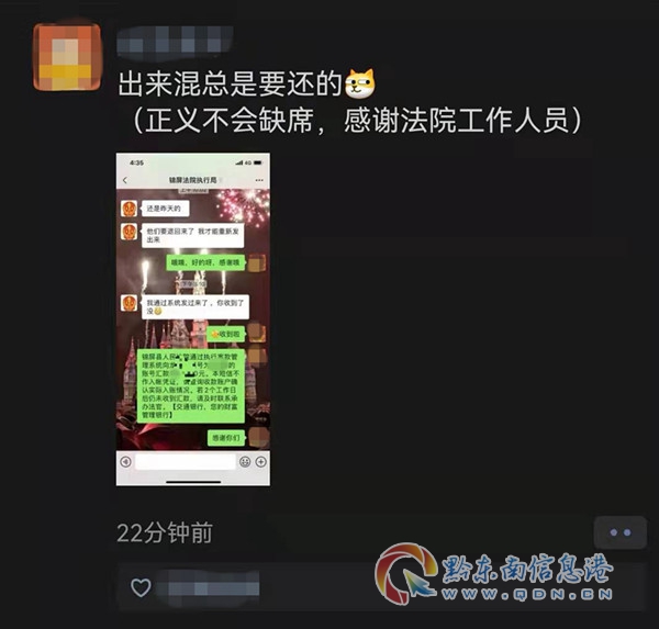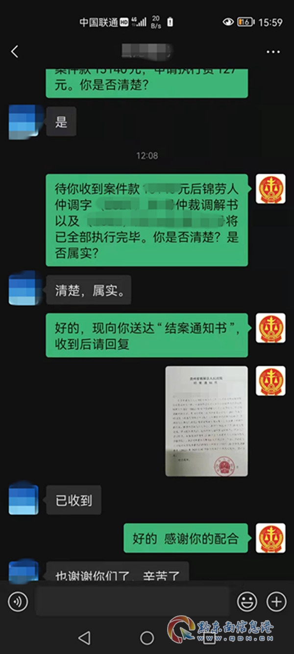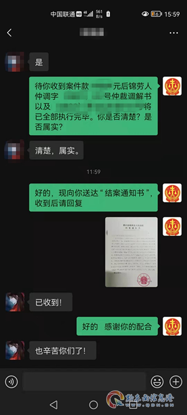 2月11日,執行法官將案款轉入龍某平等四人賬戶,并通過微信確認其是否收到,龍某平當即向執行干警表示感謝。當事人的一聲感謝,是對錦屏法院執行工作的認可,同時激勵著法院人認真履職,辦好每一個案件,讓申請人手中的生效判決得到真金白銀的兌現。(覃振華)