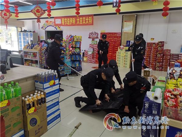 根據演練警情設置,巡邏隊員在巡邏中接到指令,在某超市內,一名有極端暴力傾向的男青年手持砍刀亂砍。接到警情指令后,特巡警大隊應急處置警力快速反應,攜帶鋼叉、警棍、盾牌等警械裝備趕往現場處置。到達現場后,指揮員通過勸說不斷吸引該男子注意力,其余警力進行左右包抄,利用鋼叉迅速將嫌疑人控制,并奪下刀具,對嫌疑人上拷帶離,達到了預期演練效果。