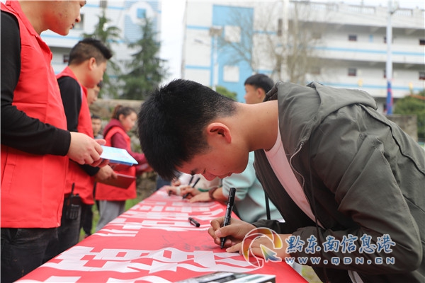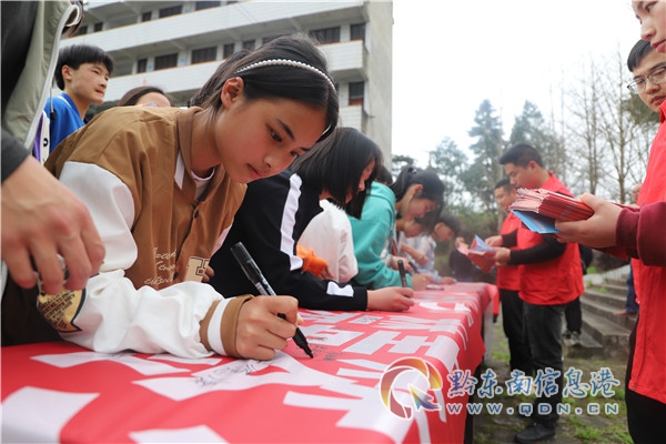 最后,由鎮領導帶頭,全體師生們一一在禁毒宣誓橫幅上認真地簽上自己的名字,更進一步增強師生們的防毒、拒毒意識,確保“學生不涉毒、校園無毒品”。