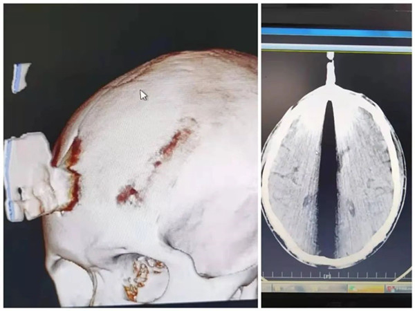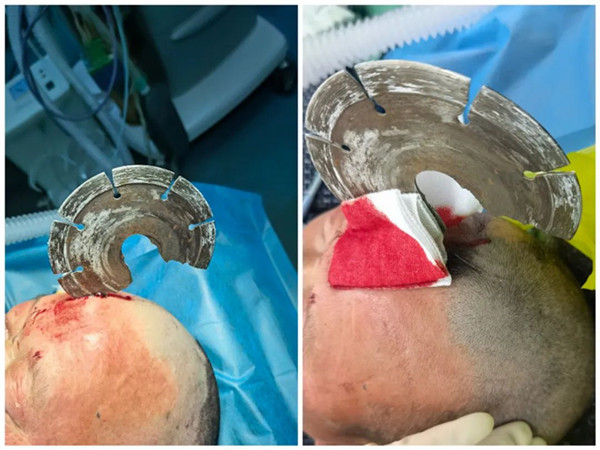 一小時后,救護車風(fēng)馳電掣開進縣人民醫(yī)院急診科。經(jīng)急診科醫(yī)生簡單檢查,確定患者為務(wù)工操作時鋸片破裂導(dǎo)致額部顱腦貫通傷并異物存留,創(chuàng)口活動性出血,病情危急,立即啟動綠色通道,患者轉(zhuǎn)入神經(jīng)外科病房。