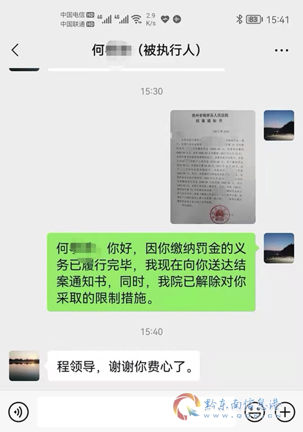 原來,撥打執(zhí)行法官電話的系何某某,系錦屏法院2017年執(zhí)行罰金案件的被執(zhí)行人,因其犯詐騙罪,被錦屏法院判處有期徒刑一年零六個月,并處罰金一萬元,何某某在判決生效后僅繳納了罰金5000元,尚欠5000元一直未繳納。該案移送執(zhí)行后,因何某某系貴州省貞豐縣人,經(jīng)過調(diào)查,除發(fā)現(xiàn)何某某有銀行存款2000余元外未發(fā)現(xiàn)有其他可供執(zhí)行的財產(chǎn),執(zhí)行法官依法以終結(jié)本次執(zhí)行程序結(jié)案,并將其納入失信被執(zhí)行人名單及限制高消費。時隔5年后,因何某某被法院納入失信名單和限制高消費,嚴重影響了其工作生活,何某某便主動聯(lián)系執(zhí)行法官將其未繳納的罰金全部繳納完畢,執(zhí)行法官也依法解除了對何某某采取的限制措施。