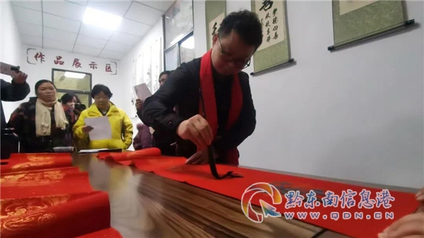 當(dāng)天的活動,7位來自凱里市文聯(lián)書法家協(xié)會的書法家9點(diǎn)左右抵達(dá)康養(yǎng)中心,這時候,當(dāng)?shù)赜行枰木用褚呀?jīng)在此等候了。來不及休息,卷紙?zhí)峁P,書法家們立馬揮毫潑墨,很快,一幅幅傳承民俗文化、歌頌偉大祖國、贊美大好山河、感謝英明領(lǐng)導(dǎo)的應(yīng)時書法作品即刻呈現(xiàn)在人們面前……對聯(lián)在手,居民們贊嘆不已,康養(yǎng)中心頓時氣氛熱烈。