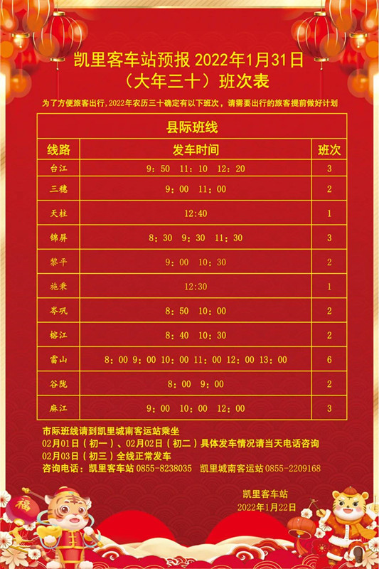 2022年春運期間單程客流出現高峰,返鄉流和學生流重疊,正班班次無法滿足旅客正常出行需求。為保障旅客正常出行,凱里客車站將增加發班班次,加班車輛將出現單程空載運行,造成營運成本增加;現決定于2022年1月26日至2022年2月6日對部分票價優惠班線的票價進行調整,票價調整的班線如下: