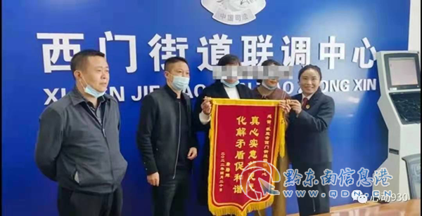多年來,凱里市問題樓盤專班多次組織雙方調解,因種種歷史原因,均未能達成調解協議。西門街道本著為人民群眾服務的宗旨,2022年4月26日,積極協調凱里市住建局、西門街道大閣社區、西門街道聯調中心等相關部門參與此次糾紛化解工作,在西門街道聯調中心調解員楊昌梅細致耐心地勸解下,糾紛雙方本著友好協商的原則,歷時5個小時的調解,最終糾紛雙方采納了調解員楊昌梅的建議,雙方達成一致協議:宇龍房地產開發責任有限公司將7套房子與6個門面市場價值615萬元移交給紡織品公司,并現場簽訂了《調解協議書》。至此,二十一年的經濟糾紛得到了圓滿解決。