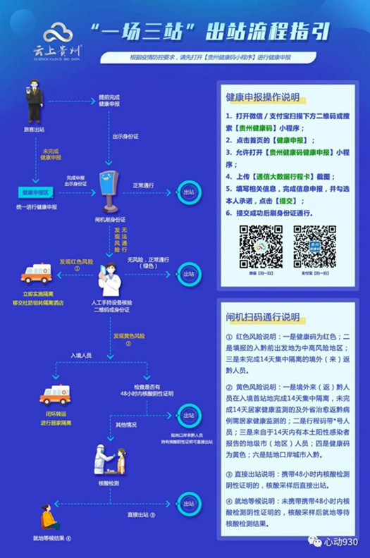 據了解,升級后的系統以貴州健康碼健康申報小程序為基礎,依托 " 一場三站 " 所部署的閘機、手持終端等對人員身份信息進行核驗,實現來返黔人員出站(港)快速分流處置,減輕旅客紙質填報的負擔。