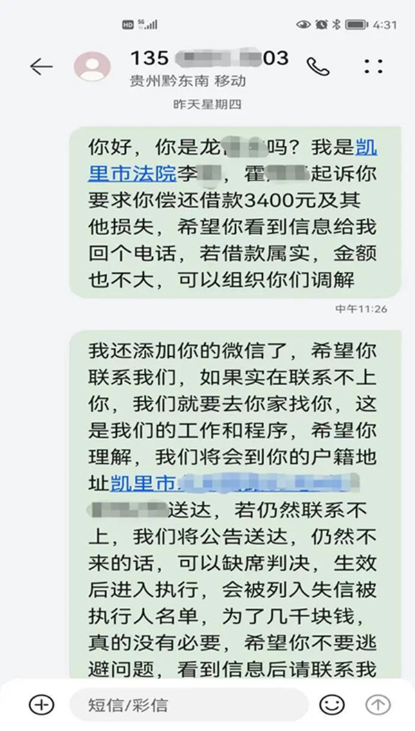 原告霍某與被告龍某原本是朋友,兩年前,龍某向霍某借款3400元后拒不償還,還將霍某電話和微信拉黑,霍某無奈起訴到凱里市法院。但是,在送達應訴材料的過程中,被告龍某拒接法院工作人員電話,法院工作人員按戶籍地址郵寄送達,郵件亦被退回。考慮到案件事實清楚,案件標的也不大,為了盡快化解糾紛,法官多次向被告龍某發送短信,告知其逃避訴訟、逃避債務的法律后果,積極參加訴訟不僅是自己的義務,同時也能更好的維護自己的合法權益。
