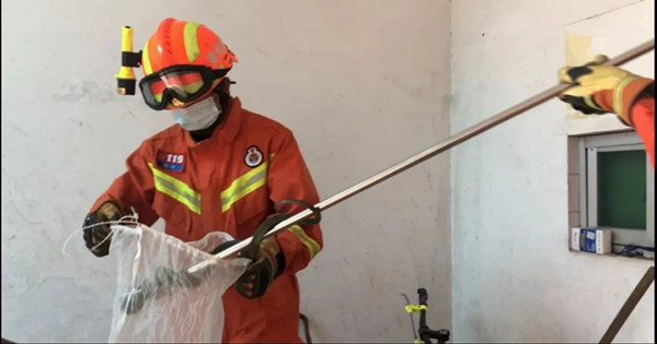 到達現場,經詢問情況后得知,報警人在準備出門時,突然一條花蛇盤臥在樓道墻角,立即撥打電話向消防求助。消防人員發現花蛇后,立即讓屋內人員撤離到安全地帶,同時一名消防救援人員戴上手套做好準備,救援人員迅速用補蛇鉗控制住蛇的頭部,將大蛇裝進了早已準備好的袋子,短短幾分鐘的時間,剛剛還令人聞風喪膽的一條大蛇就被乖乖的制服了,屋主終于松了口氣。隨后,消防救援人員驅車將抓獲的花蛇拿到樹林中放生。