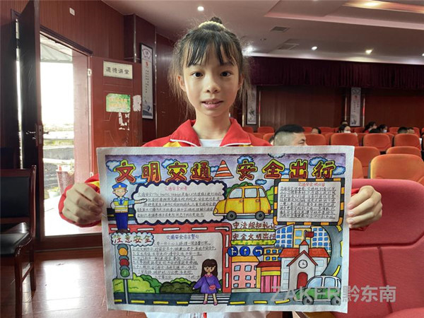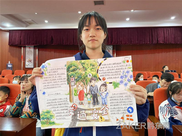 頒獎會上,先后為榮獲一、二、三等獎的同學們進行頒獎。來自凱里市第四中學八年級(3)班的趙夢琪在此次活動中榮獲了初中組一等獎,趙夢琪告訴記者,自己創作的這幅名為《交通安全》的手抄報靈感來源于網上的動畫,通過借鑒動畫的畫風來進行整體構圖,告訴大家要積極遵守交通規則,過斑馬線時要注意紅燈綠燈,做到交通安全伴我行。