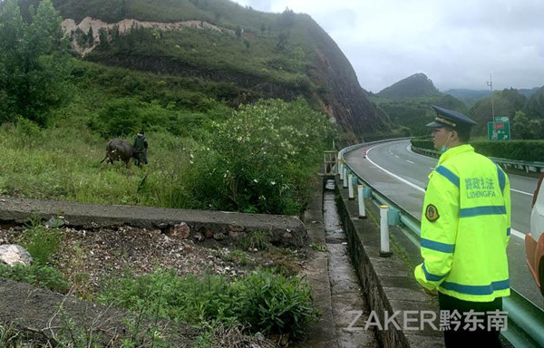 考慮到水牛未栓繩,隨時有可能再次誤入高速公路,執法人員便決定尋找牛的主人。執法人員和高速交警兵分兩路到附近村寨挨家挨戶尋找失主," 功夫不負有心人 ",經過 1 個多小時的走訪,終于在凱里市新寨村找到了牛的主人陳某。