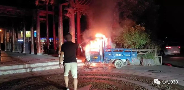 待通行信號燈轉為綠燈后,熊凱明趕緊開車往風雨橋方向駛去,這才發現,這哪是云啊!這是緊挨風雨橋停放的一輛三輪車自燃帶來的滾滾濃煙。