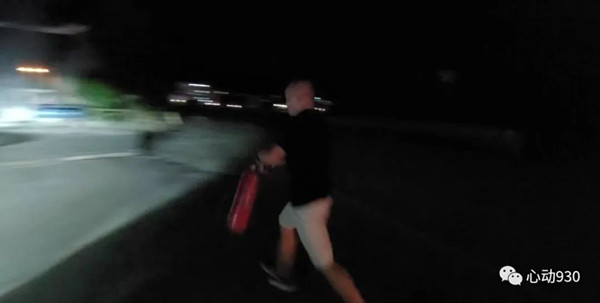 火勢不斷蔓延,熊凱明立即轉身跑向自己的車,拿出車載滅火器對著起火點噴了過去。