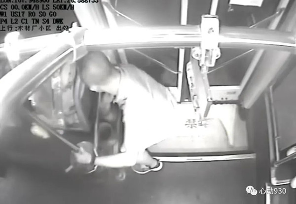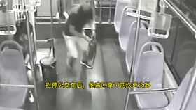 順利攔停公交車后,熊凱明一個箭步沖上車,表明身份后拿到了滅火器。
