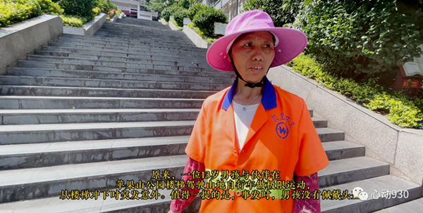 在蘋果山公園大門前的臺階上,一輛操作失誤的自行車闖入了眾人視線,伴隨著一陣車輪和地面摩擦的聲音,劃破了原本的寧靜。