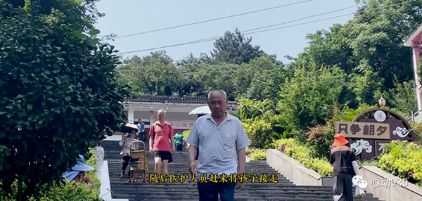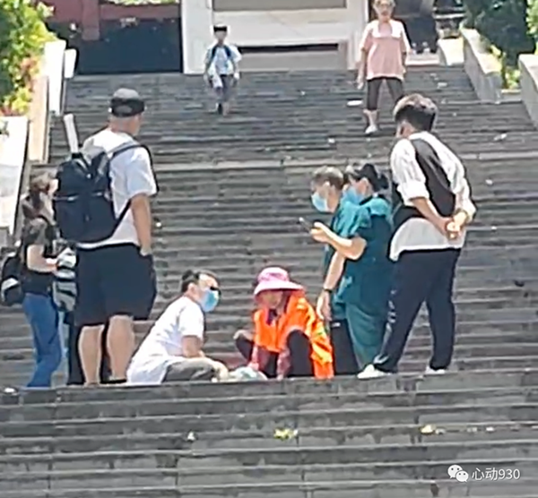 就這樣,頂著大太陽的趙世芝用自己的手臂當起了“人肉枕頭”,墊在男孩頭部。“我一是怕臺階太硬對他造成傷害,第二就是太陽太大了,曬得地上也發燙,頭放在上面肯定很難受。” 不僅如此,害怕不能動彈的男孩被太陽曬傷,趙世芝還取下了自己頭上的遮陽帽,擋在男孩臉上。