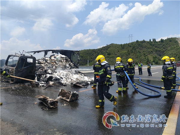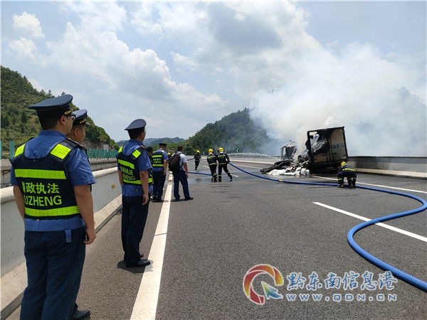 為確保應急處置工作有序展開,執法人員及時啟動“路警企”應急處置預案,在前往現場的同時,第一時間告知轄區消防隊、高速交警及凱里繞城高速應急救援部門前往現場。13時05分,執法人員到達事故現場并了解具體情況,現場位于S07凱里繞城高速K36+400下行(往凱里北方向)。事故原因為一輛拉葡萄糖粉末的廂式貨車,因電路短路造成車輛自燃,現場無人員傷亡,目前車輛停滯于行車道與應急車道中間。為保障車輛通行安全,避免二次事故的發生,執法人員協助消防部門快速開展滅火工作,并協同高速交警部門實施交通管制,設置安全警示區。