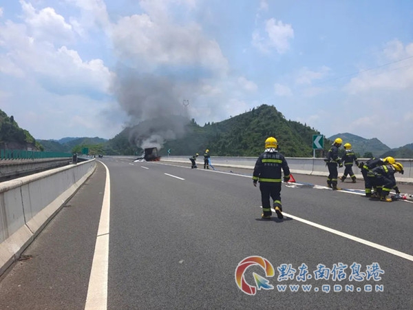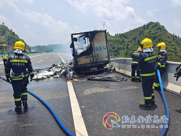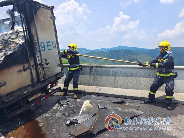 本網(wǎng)訊 7月6日中午12時(shí)40左右,在黔東南州S07凱里繞城高速插旗山大橋上有一貨車自燃起火。接到報(bào)警后,凱里市消防救援大隊(duì)消防救援人員迅速趕往現(xiàn)場(chǎng)。