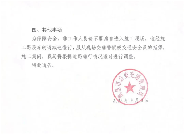 為保障安全,非工作人員請不要擅自進入施工現場,途經施工路段車輛請減速慢行,服從現場交通警察或交通安全員的指揮。施工期間,我局將根據道路通行情況適時進行調整。
