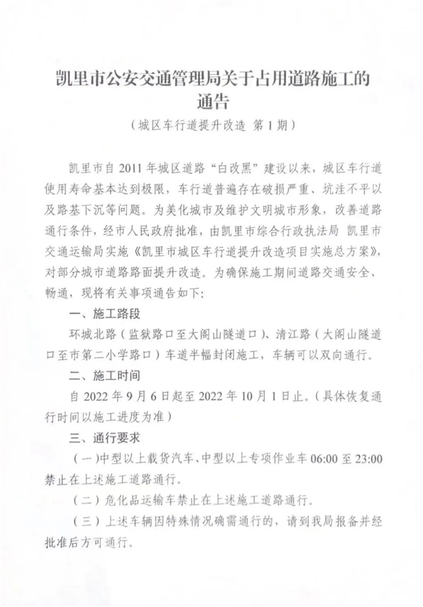 凱里市自2011年城區道路“白改黑”建設以來,城區車行道使用壽命基本達到極限,車行道普遍存在破損嚴重、坑洼不平以及路基下沉等問題。為美化城市及維護文明城市形象,改善道路通行條件,經市人民政府批準,由凱里市綜合行政執法局凱里市交通運輸局實施《凱里市城區車行道提升改造項目實施總方案》,對部分城市道路路面提升改造。為確保施工期間道路交通安全、暢通,現將有關事項通告如下: