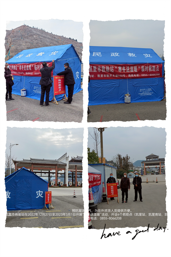 凱里市救助站于2022年12月27日至2023年3月1日開展“寒冬送溫暖”活動,開設4個臨時救助點(凱里站,凱里南站,凱里東站,凱里翁稍站),為需要的群眾提供幫助,24小時聯(lián)系電話:0855-8066208。