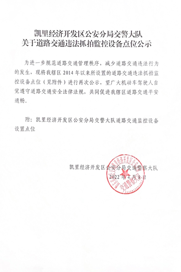 為進一步規范道路交通管理秩序,減少道路交通違法行為的發生,現將我轄區2014年以來所設置的道路交通違法抓拍監控設備點位(見附件)進行再次公示,望廣大機動車駕駛人自覺遵守道路交通安全法律法規,共同促進我轄區道路交通平安通暢。