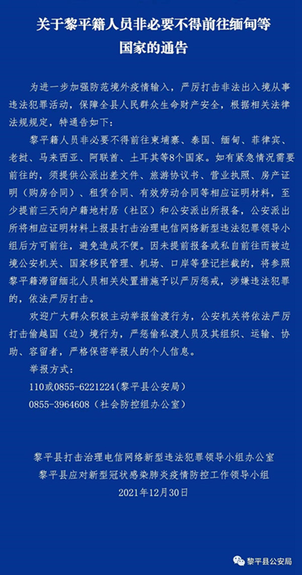 關于黎平籍人員非必要不得前往緬甸等國家的通告