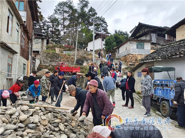 在陸支書的動員號召下,全村約有100余名村民,在村“兩委”和駐村工作隊的帶領下,紛紛投入到修建寨內花臺的活動中,盡管室外氣溫只有5攝氏度,但男女老少不畏嚴寒,卸車、搬石塊、撿石頭、和水泥、鋪砂石,現場熱鬧非凡。
