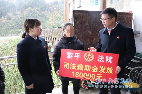 2021年,一場機動車交通事故讓楊文某造成重傷,一級傷殘導致癱瘓在床,靠妻子和家屬照管,而肇事方又是剛脫貧人口。案件判決后,無法承擔高額費用。該案進入執行程序后,在執行過程中發現兩個被執行人確無財產可供執行,而申請人完全喪失勞動能力,又有兩個小孩需要撫養,現在醫藥費無望,又沒有固定收入,家庭陷入絕望,于是便向法院申請司法救助。黎平法院決定依法積極為申請人申請司法救助,幫助其度過難關。司法救助款審批通過到賬后,黎平法院一邊安排撥款,一邊安排干警冒著雨雪天氣,趕在春節前將180000元送到當事人家中,好讓一家人過一個溫暖的春節。