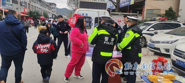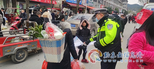“趕年場”是指農歷春節前的最后一個趕集日,這是一年365天中最熱鬧的一天,畢竟采購年貨,是每個家庭的必需,許多群都在忙著趕年場、備年貨,喜迎新春佳節。隨著扎入集市群眾的增多,各類交通違行為也增多,群眾安全意識淡泊,為預防交通事故,保護群眾安全,黎平公安交警大隊一大早就從縣城驅車前往敖市鎮,在管控道路的同時,聯合派出所一起開展“平安回家、團員過年”的宣傳活動,走上街頭向廣大群眾宣傳,發放宣傳資料,提示群眾不要酒后駕駛、無證駕駛、非法乘坐三輪車、乘坐超員超載車輛,提醒駕乘人員系好安全帶,只有平平安安,才能開開心心過春節。