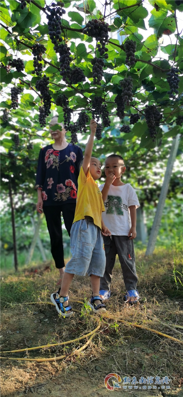 在葡萄園里,逐漸成熟的一竄竄紫葡萄像一顆顆晶瑩的紫寶石,讓人垂涎欲滴,游客邊采摘邊拍抖音,分享此刻的美好。