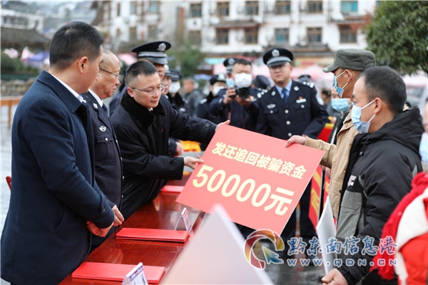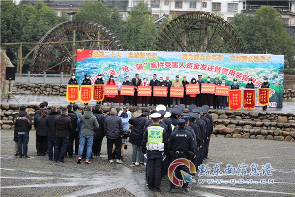 2022年1月27日上午,在貴州省黔東南州雷山縣城木鼓廣場舉行了雷山縣“盜、搶、騙”案件受害人資金返還暨警用裝備展示儀式,縣委常委、縣委政法委書記黃博,縣人民政府副縣長、縣公安局局長楊順燈出席并講話,公、檢、法、司相關負責同志和8名受害群眾代表參加儀式。