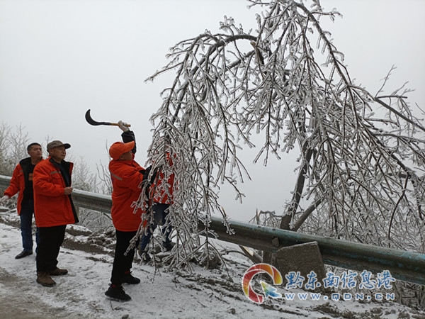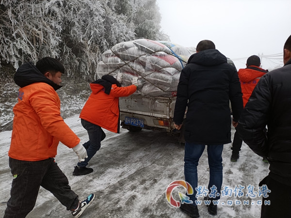 在省道S204線,凜冽的寒風和結冰的路面,使除冰工作變得艱難,雷山公路管理段利用機械+人工的方式,噴灑融雪劑和工業鹽,在零下的寒風中,分工有序地清理結冰路面;路遇到受困的群眾車輛,大家紛紛上前幫忙救助,這一刻在一片白皚皚的雪景中,干群齊心協力的背景顯得尤為動人。