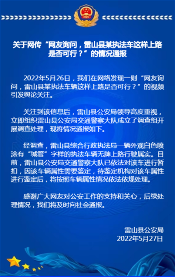關于網傳“網友詢問,雷山縣某執法車這樣上路是否可行?”的情況通報