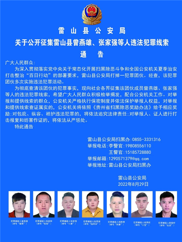 黔東南一地公開征集曾燕雄、張家強(qiáng)等7人違法犯罪線索